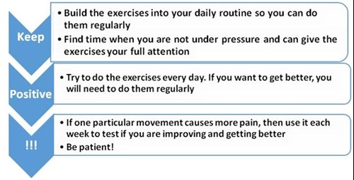 A rehabilitation programme starts with easier exercises and then needs to be progressed until you are able to do the activities you need to do with less pain, so don’t give up too early!